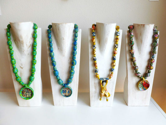 Es war immer schon meine Leidenschaft mit Papier Schmuckstücke zu zaubern. In meinem Atelier in Berlin habe ich Colliers kreiert. Verrückte Gegenstände, die man sich um den Hals legt. Ich habe all diese schönen Stücke noch - und werde sie nach und nach hier vorstellen ... Derzeit arbeite ich mit Hingabe an Halsketten, die sehr interessante Anhänger haben. Zum Beispiel eine Dame die schaukelt... Oder einen schönen goldenen Fisch, der an einer Kette aus durch und durch japanischen Papieren schwebt. Bald wird es mehr Fotos davon geben ...